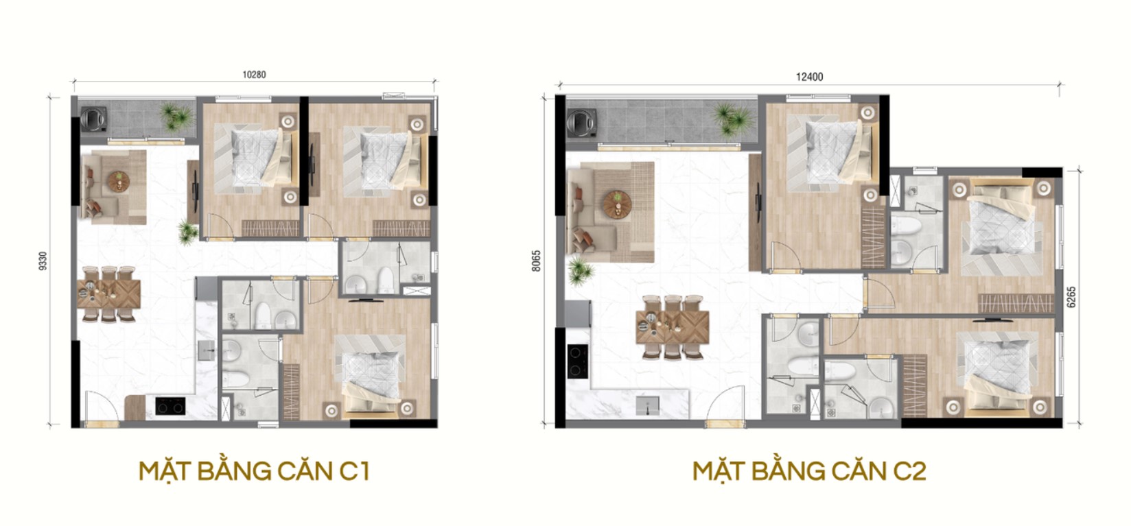 - Căn 2PN 2WC: phổ biến nhất dự án, diện tích từ 55 m² đến 74 m² – lựa chọn lý tưởng cho gia đình trẻ với thiết kế hai vệ sinh riêng biệt, tạo sự tiện nghi và riêng tư.